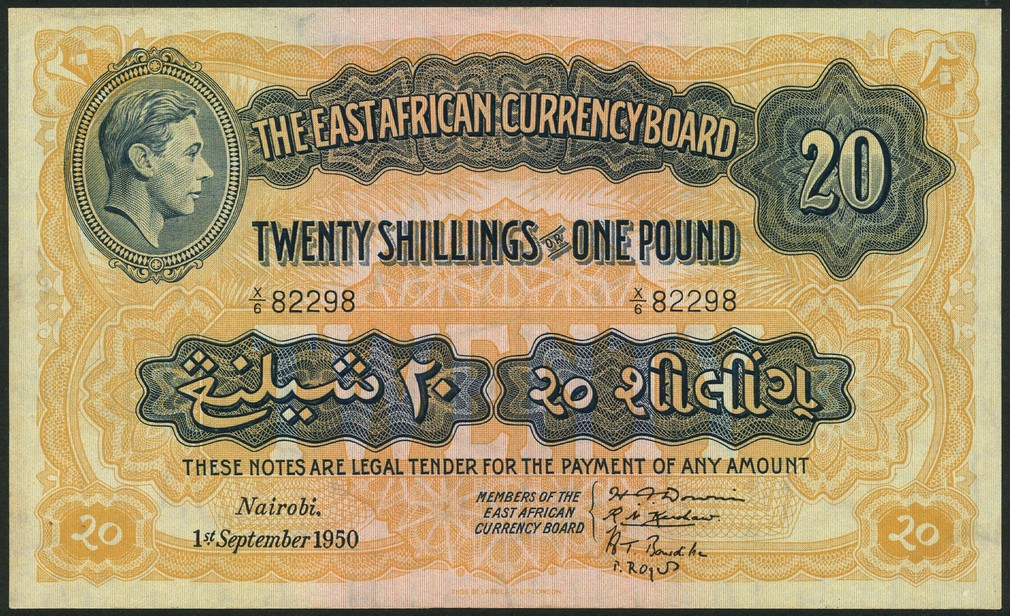 East African Currency Board, 20 shillings (3), 1 September 1950, 1 August 1951 and 1 January 1952, prefixes X/6, B38 and B83, dark blue on multicolour underprint, George VI at top left, value at centre, top right and each corner, reverse orange, lion at centre