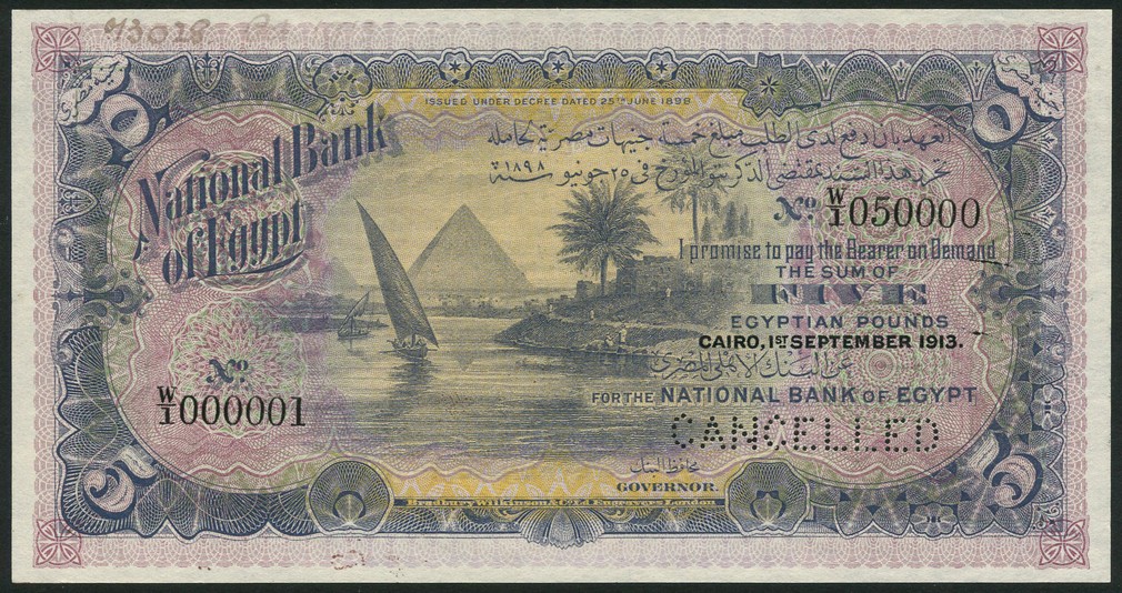 (†) National Bank of Egypt, printer's archival specimen 5 Pounds, 1 September 1913, serial number run W/1 000001 to W1 050000, no signature, lilac, yellow and pale green underprint, feluccas on the Nile ('Haby'), pyramids in background, value in each corner, reverse lilac and pale orange and green, value at left and right set in ornate guilloches