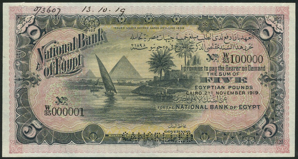 (†) National Bank of Egypt, printer's archival specimen 5 Pounds (2), 2 November 1919, 21 April 1920, serial number run W/35 000001 to W35 100000, W/46 000001-W/46 100000, no signature, black on lilac, yellow and pale green underprint, feluccas on the Nile, pyramids in background, value in each corner, reverse value at left and right set in ornate guilloches,