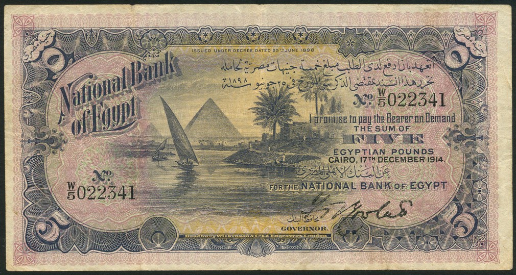 National Bank of Egypt, £5, 17 December 1914, serial number W/5022341, black, mauve, pale orange brown, feluccas and pyramids centre left, value at right and in each corner, Rowlatt signature, reverse, mauve, value at left and right