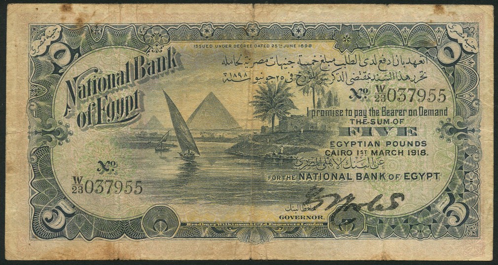 National Bank of Egypt, £5 (2), 18 October 1916 and 1 March 1918, serial numbers W/10 058779 and W/23 037955, black, mauve, pale orange brown, feluccas and pyramids centre left, value at right and in each corner, Rowlatt signature, reverse, mauve, value at left and right