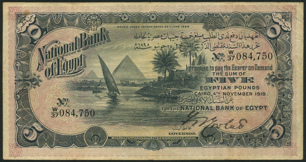National Bank of Egypt, £5 (2), 4 November 1919 and 21 April 1920, serial numbers W/37 084,750 and W/45 067,096, black, mauve, pale orange brown, feluccas and pyramids centre left, value at right and in each corner, Rowlatt signature, reverse, mauve, value at left and right