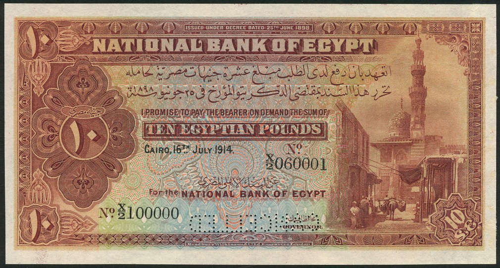 (†) National Bank of Egypt, specimen £10, 16 July 1914, serial number X/2 100000-X/2 060001, brown & multicoloured, Old Cairo street scene and the Mosque of Qayetbay at right, value at left, reverse brown, value at left and right