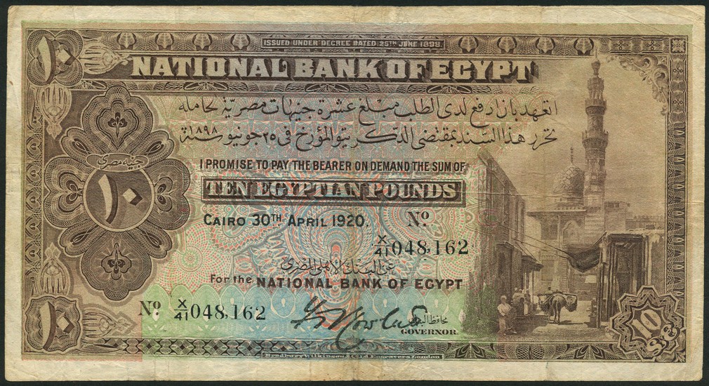 National Bank of Egypt, £10, 30 April 1920, serial number X/41 048,162, purple-brown and multicoloured, the Mosque of Qayetbay and street scene at right, Rowlatt signature, reverse, brown