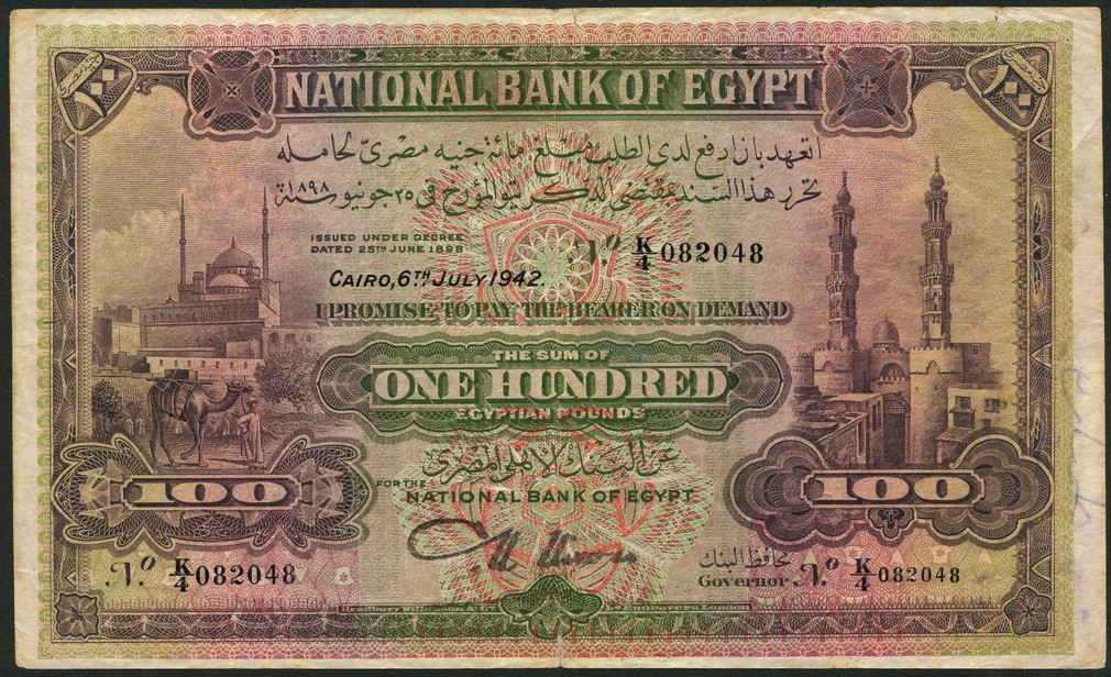 National Bank of Egypt, £100, 6 July 1942, serial number K/4 082048, purple, green and pink, the Zuwayla Gate and Citadel of Cairo at left, Mosque of al'Mu'ayyad Sheik at right, value in green tablet at centre and at each corner, Nixon signature, reverse, dhow and Island of Philae
