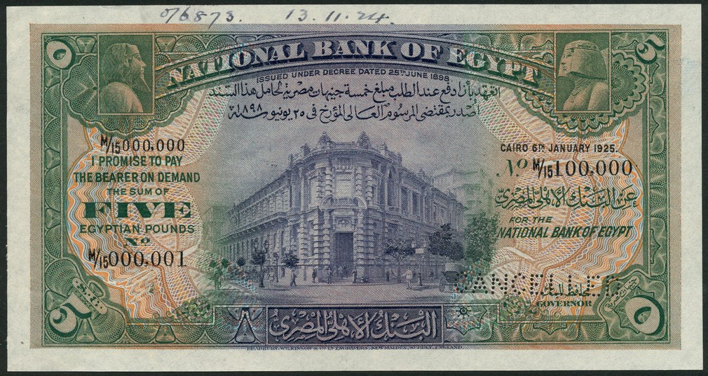 (†) National Bank of Egypt, printer's archival specimen 5 Pounds , 6 January 1925, serial number M/15 000001-M/15 100000, no signature, green, blackish purple and multicoloured, National Bank building at centre, value in each corner, reverse blue and red on green and orange underprint, palm trees and building at centre, value in guilloches at right and left