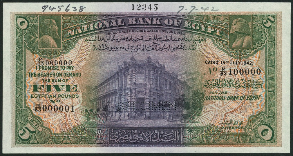 (†) National Bank of Egypt, printer's archival specimen 5 Pounds (2), 14 July 1942, 15 July 1942, serial numbers M/62 000001-100000,M/63 000001-100000, green, blackish purple and multicoloured, National Bank building at centre, value in each corner, no signatures, reverse blue and red on green and orange underprint, palm trees and building at centre, value in guilloches at right and left