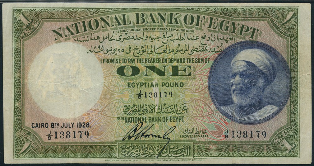 National Bank of Egypt, 1 pound, 8 July 1928, green and dark blue, the Fellah Idrees at right, Hornsby signature, reverse violet, the Mosque of al-Mansour Seif-el-Dein Qa'la Un at centre