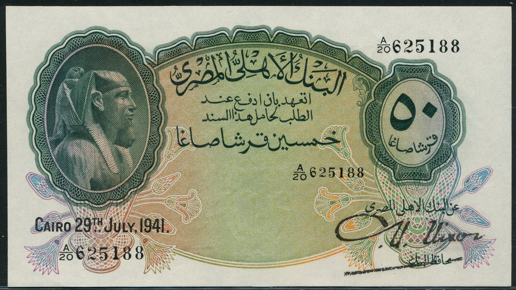 National Bank of Egypt, 50 piastres (4), 29 July 1941, serial numbers A/20 625188-91, green on multicolour, Tukankhamen at left, value at right, large Nixon signature