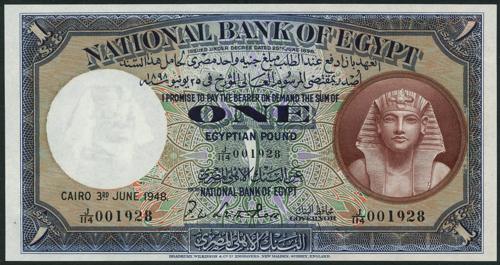 National Bank of Egypt, 1 pound (5), 3 June 1948, serial numbers J/114 00195-98 and 001926, blue and brown on multicolour underprint, Tutankhamen at right, value at centre and each corner, Leith-Ross signature, reverse green, the Mosque of al-Mansour Seif-el-Dein Qa'la un at centre