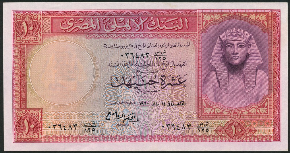 (x) National Bank of Egypt, a group of notes comprising 50 piastres (2), 1952, 1960, serial numbers 333538 and 945940, £10 (2), 1958, 1960, serial numbers 018182 and 036483, £5, 1961, serial number 067399