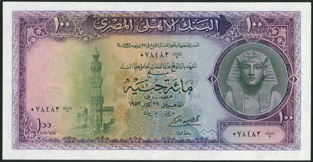 (x) National Bank of Egypt, £100, 1952, serial number 078482, violet, green and multicolour, Tutankhamen facing at right, minaret at left, reverse purple, Mosque at centre