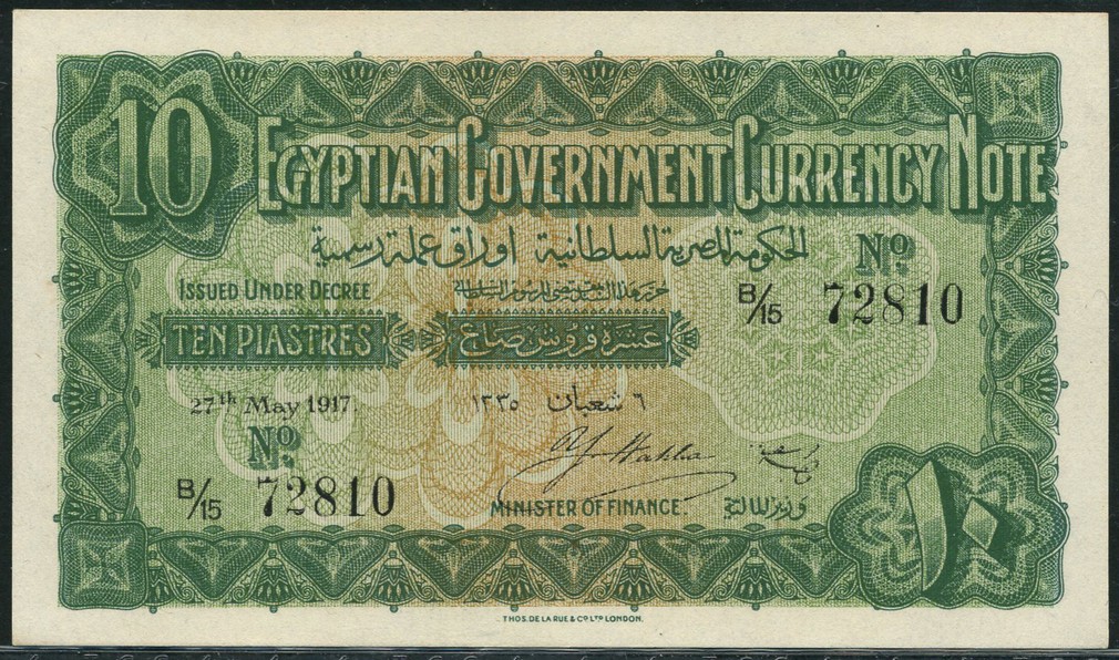 Egyptian Government Currency notes, 10 piastres (2), 27 May 1917, serial numbers B/15 72809 and B/15 72810, green on tan and light green underprint, value at top left and low right, reverse blue, Colossi of Memnon at centre, Yousef Wahba signature