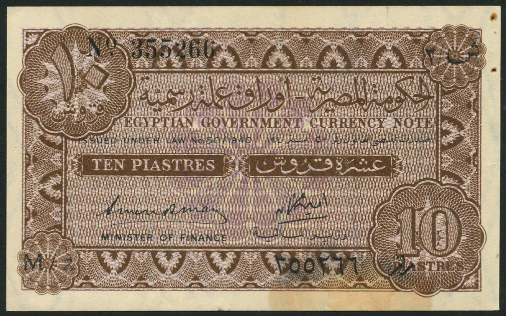 Egyptian Government Currency Note, 10 piastres (3), ND (law 50/1940), brown on lilac underprint, reverse, blue, view of the Nile and Citadel, three different signature varieties