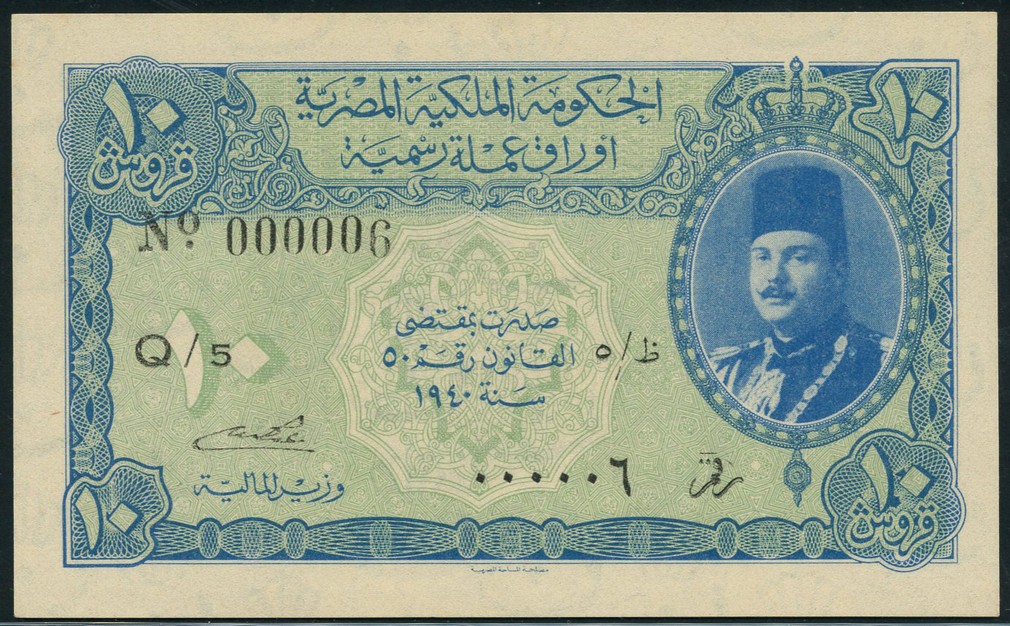 Egyptian Government Currency note 10 piastres, ND (1940s), serial number Q/5 000006, blue on green underprint, King Farouk at right, value at left, reverse green on orange underprint, A. Badr signature variety