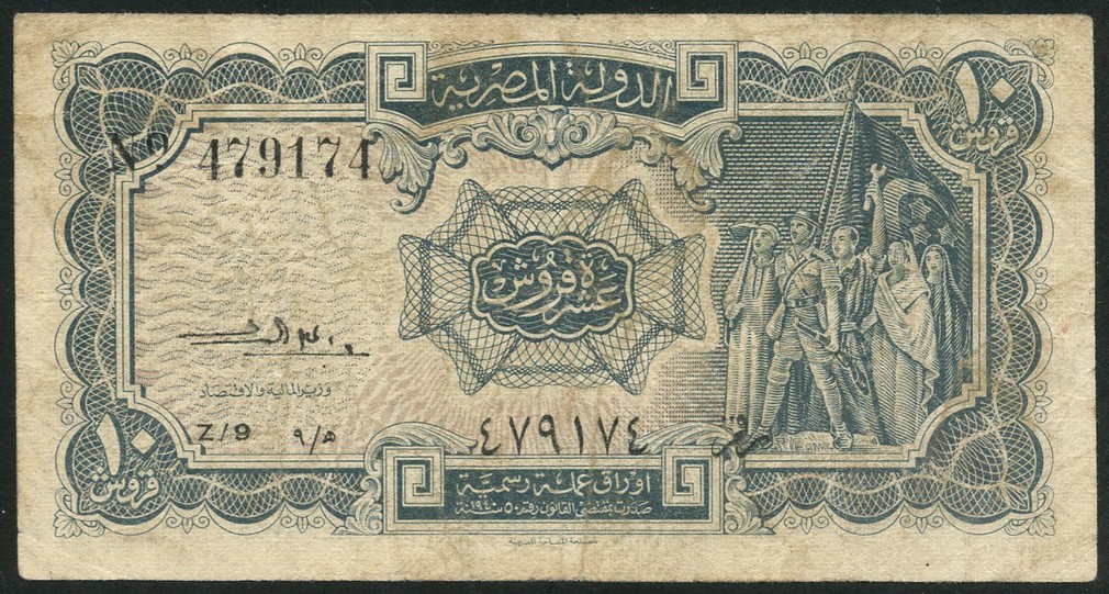 Egyptian State, 10 piastres, ND (1952), serial number 479174, blue-grey on light brown underprint, group of people with flag at right, overprint pattern on King Farouk watermark at left