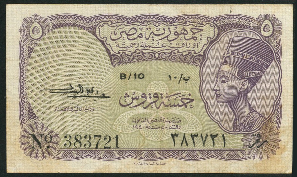 Egyptian Republic, 5 piastres, ND (1952), serial number 383721, lilac and green, Queen Nefertiti at right, patterned overprint on King Farouk watermark at left, reverse, brown