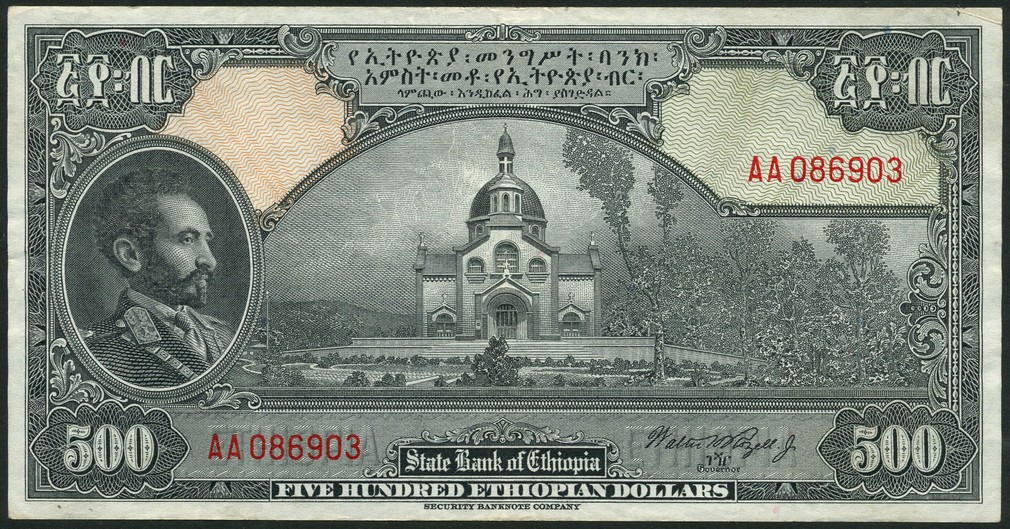 State Bank of Ethiopia, $5, $100 and $500, ND (1945-54), all black on multicolour underprint, Haile Sellasie at left, value at each corner, reverse orange, mauve and olive green respectively, crowned lion at centre