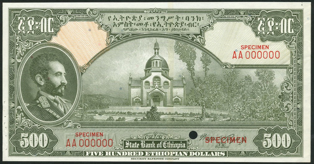 State Bank of Ethiopia, a group of uniface colour trials for the ND (1945) issue, comprising $1, green, $5, orange, $10, red, $50, blue and $500, olive green, all with Haile Selassie at left, buildings and monuments at centre, one cancellation hole and red SPECIMEN overprints