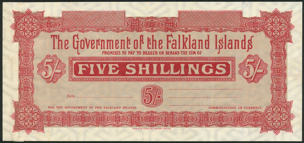 (x) Government of the Falkland Islands, a colour trial 5 shillings, ND (ca 1901), no serial numbers, red and pale beige-pink, value in red tablet at centre, value at left and right and low centre