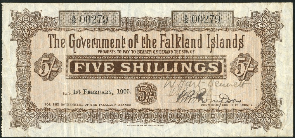 (x) Government of the Falkland Islands, 5 shillings, 1 February 1905, serial number A/2 00279, pale and dark brown, value in dark brown tablet left centre, value at left and right and low centre, three manuscript signatures low right