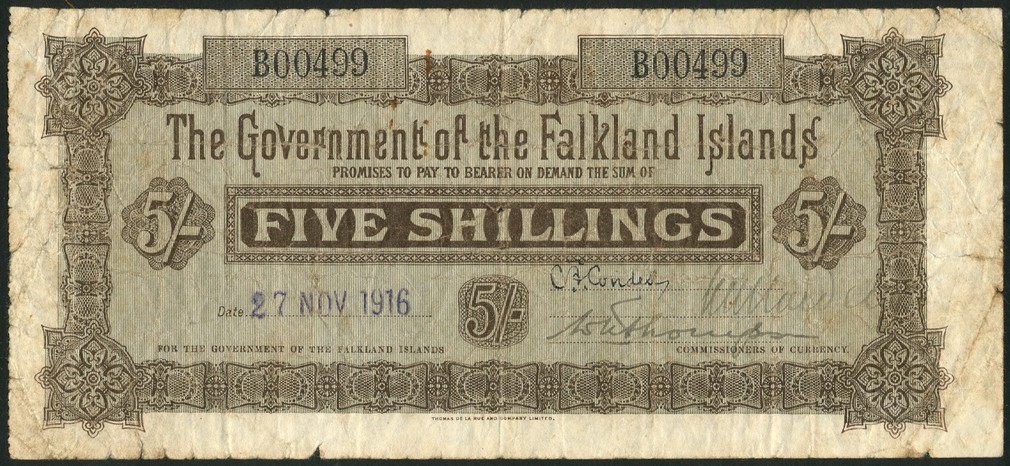 (x) Government of the Falkland Islands, 5 shillings, 27 November 1927, serial number B 00499, brown and pale blue-grey, value in brown tablet at centre, value at left and right and low centre, three manuscript signatures low right