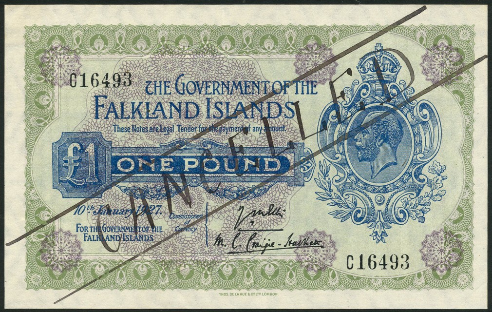 (x) Government of the Falkland Islands, £1, 10 January 1927, serial number C 16493, green and lilac, value in blue tablet left centre, crowned head of George V at right in blue, two printed signatures low right centre, reverse blue guilloche at centre