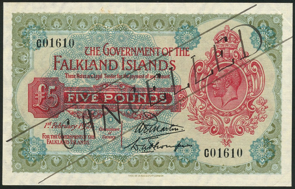 (x) Government of the Falkland Islands, £5, 10 January 1927, serial number C 01610, green, pale pink and blue, value in red tablet left centre, crowned head of George V at right in red, two printed signatures low right centre, reverse red guilloche at centre