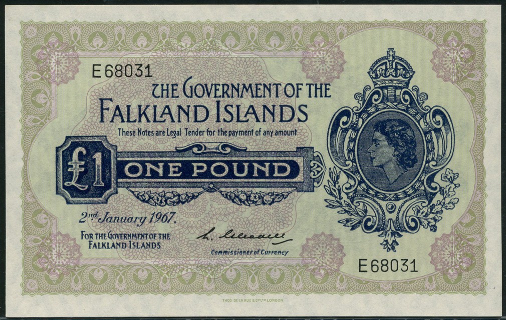 (x) Government of the Falkland Islands, £1 (2), 1967,1982, blue and lilac and pale green, Elizabeth II at right, value in blue tablet left centre
