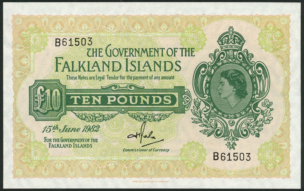 (x) Government of the Falkland Islands, £10, 15 June 1982, serial number B 61503, pale orange-brown and green, crowned head of Elizabeth II at right, value in green tablet left centre, reverse pale green
