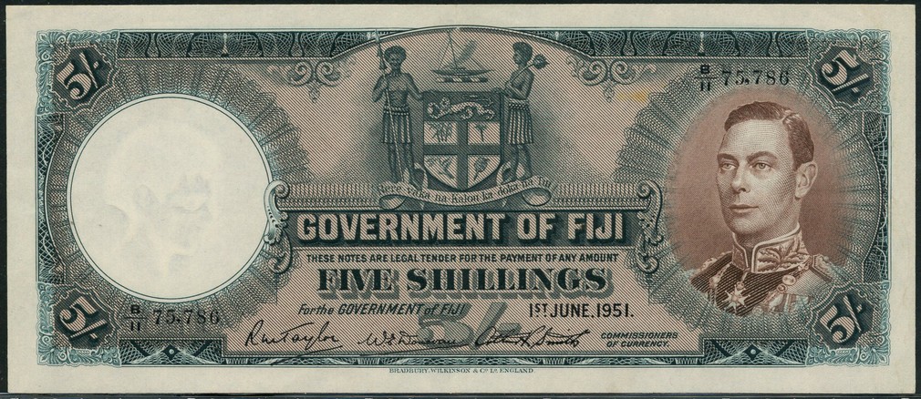 (x) Government of Fiji, 5 shillings, 1 June 1951, prefix B/11, blue-green, George VI at right, arms top centre, Taylor, Donovan and Smith signatures