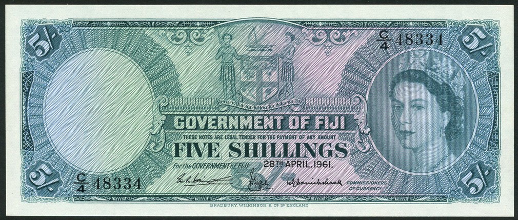 (x) Government of Fiji, 5 shillings, 28 April 1961, prefix C/4, blue-green, Elizabeth II at right, arms top centre, Bevington, Griffiths and Cruickshank