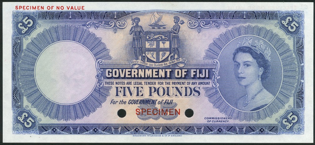 (†) Government of Fiji, specimen colour trial £5, ND (c.1954), no serial numbers, no signatures, blue on lilac and pale green underprint, portrait of Queen Elizabeth II at right, value in each corner, reverse blue, value at centre, ornate guilloches at left and right, overprinted SPECIMEN in red on obverse and reverse, two punch holes
