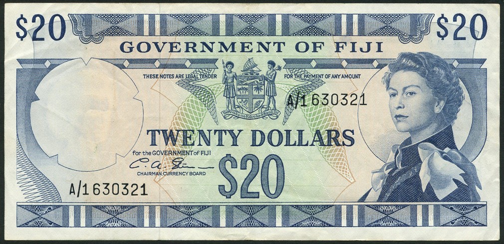 Government of Fiji, $2 (4), ND (1971), serial number A/4 947322/23/24/25, green, Wesley Barrett signature, $1, brown, Stinson signature and $20, serial number A/1 630321, blue, Stinson signature, all Elizabeth II and arms in field