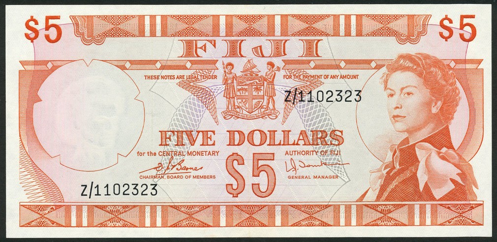Central Monetary Authority, Fiji, $5, ND (1974), serial number Z/1 102323, orange, Elizabeth II at right, arms at centre, Barnes and Tomkins signatures