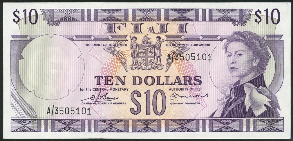 Central Monetary Authority, Fiji, $10, ND (1974), serial number A/35 05101, purple, Elizabeth II at right, arms at centre, Barnes and Earland signatures