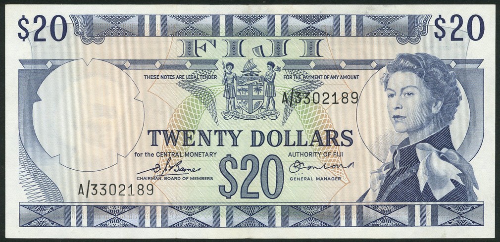 Central Monetary Authority, Fiji, $20, ND (1974), serial number A/3 302189, blue and green, Elizabeth II at right, arms top centre, Barnes and Earland signatures