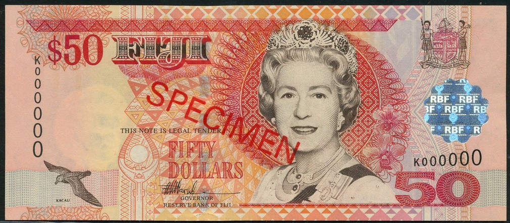 (x) Reserve Bank of Fiji, specimen $50, ND (2002), prefix K, red and multicoloured, Elizabeth II at right, also Botswana specimen 100 pula, ND (1993), blue