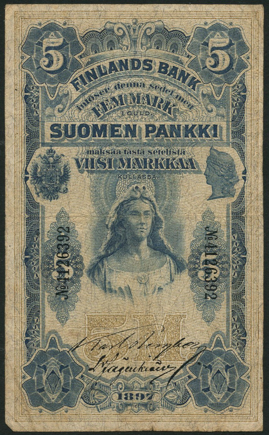 Finlands Bank, 5 markkaa, 1897, serial number 4126392, blue, arms at left, woman at centre, reverse, dark blue, arms at centre, value top and lower centre, also Sveriges Riksbank, 5 kronor, 1899, serial number P,38141, black, Svea seated at right, value top left and low right and at centre, reverse Gustav Vasa in oval at centre
