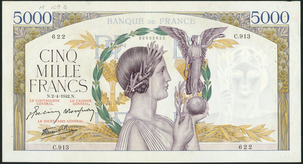 Banque de France, 50 NF, 7 April 1960, serial number V.50-45207, blue, red and multicoloured, 'Le Pont Neuf' at centre, Henri IV at centre, D'Ambrieres, Tondu and Gargam signatures, reverse red and multicoloured, Henri IV and the Chateau de Pau, also 5000 francs, 2 April 1942, serial number C.193-622, multicoloured, 'Victoire', Belin, Favre-Gilly and Rousseau signatures