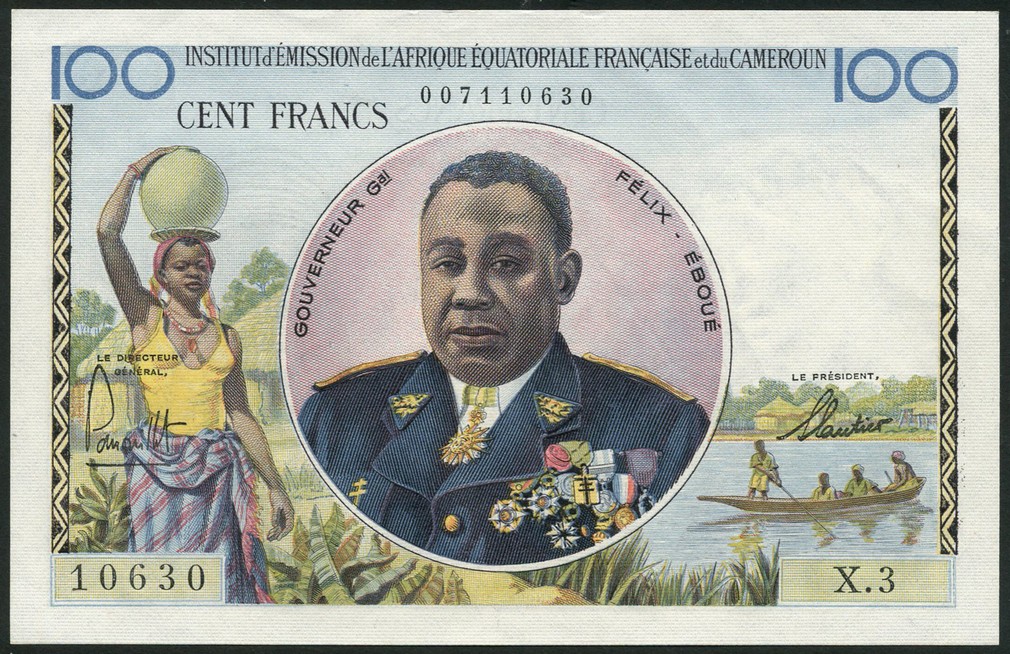 (x) Institut d'Emission de L'Afrique Equatoriale Francaise et du Cameroun, 100 francs, ND (1957), serial number X.3 10630, multicolour, Gov. Gen. Felix Eboue at centre, girl with large jug on her head at left, canoe at right, reverse old man at right, dock with ships at centre and left