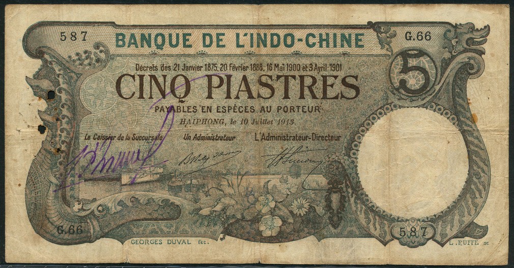 Banque de L'Indo-Chine, 5 piastres, Haiphong, 10 July 1913, serial number G/66 587, dark grey and dark green, flowers at low centre, ships at low left, value at top right, reverse brown, dragons at each side