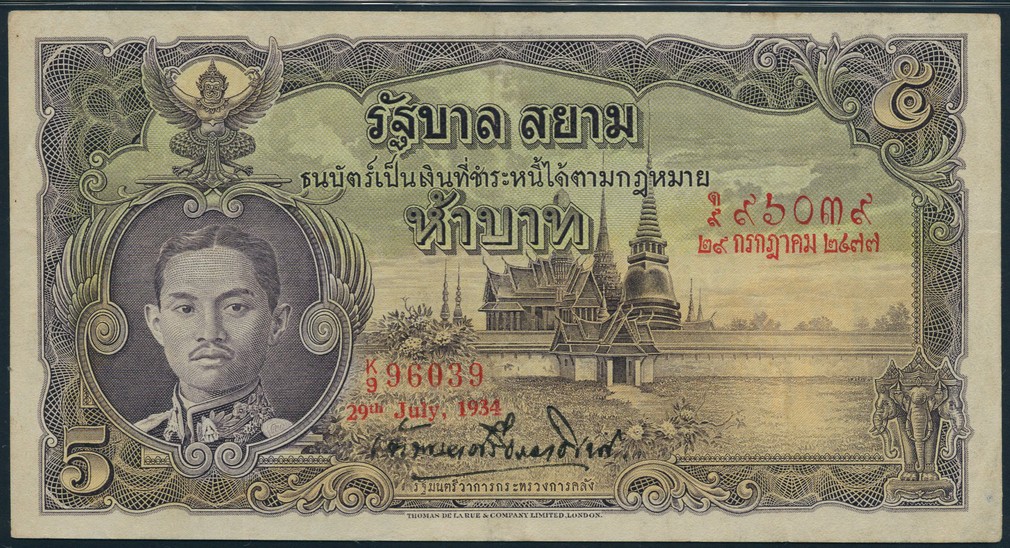 (x) A small group of notes, comprising French Indo-China, 200 piastres, 1953, elephant at left, water buffalo at right (Pick 109), Kingdom of Siam, 5 baht, 29 July 1934, purple, green and yellow, King Rama VII at left (Pick 23), De Javasche Bank, 100 gulden, 1946, brown, rice paddy at left (Pick 94), East African Currency Boar, 5 shillings, ND (1958), brown, Elizabeth II at left (Pick 37),