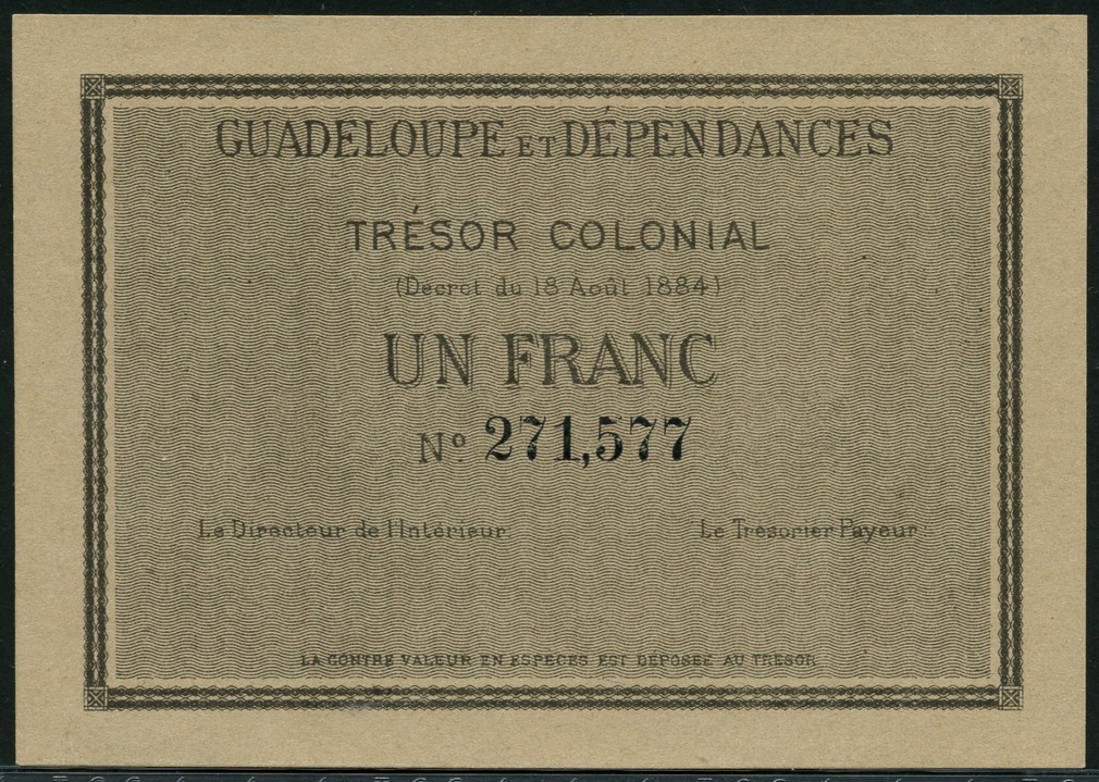 Guadeloupe et Dependances, Tresor Colonial, a part issued 1 franc, serial number 271577, Decree of 1884, dark and light grey,