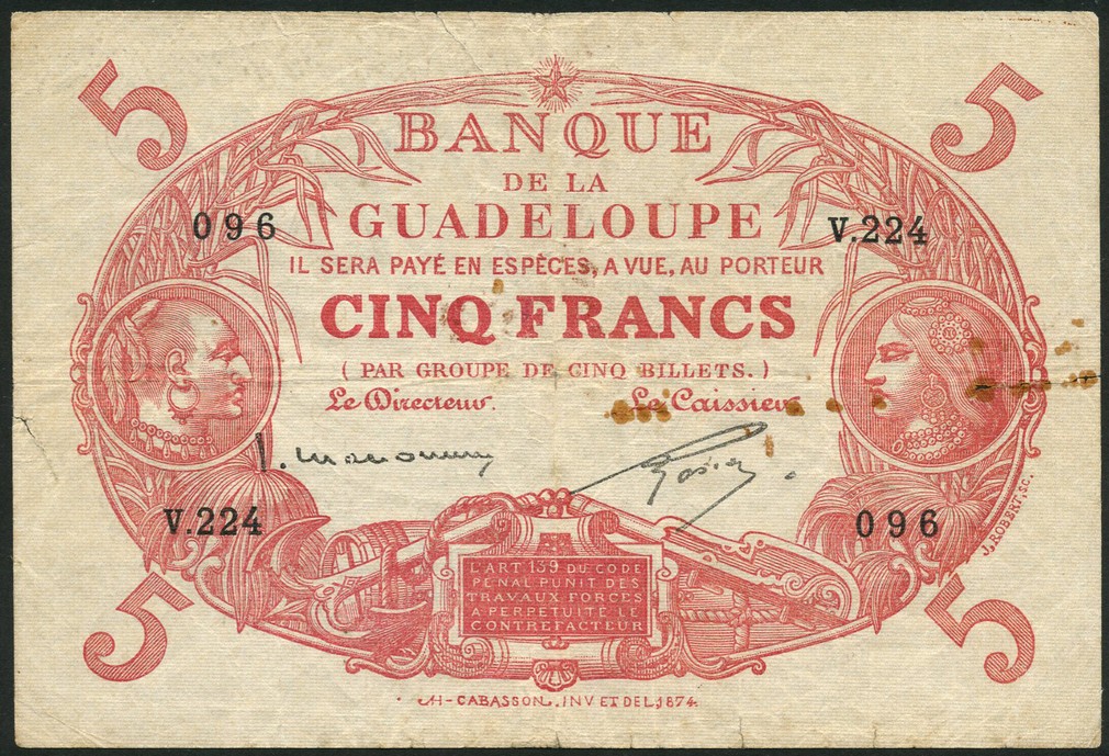 Banque de la Guadeloupe, 5 francs (2), Cabasson, ND (1934-1943), prefixes G.250 and V.224, red and white, head of indigenous man at left, woman at right, signatures of Marconnet and Gascon, reverse grey and white, indigenous female head at centre, local flora and fauna in field