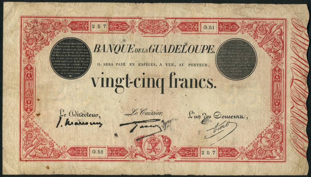 Banque de la Guadeloupe, 25 francs, ND (1934-1943), serial number G.51-257, red and white, black circular frames top left and right with penalty text, signatures of Marconnet, Gascon and Picard, reverse red and white, 'la rade de Saint Pierre' at centre, local flora in field