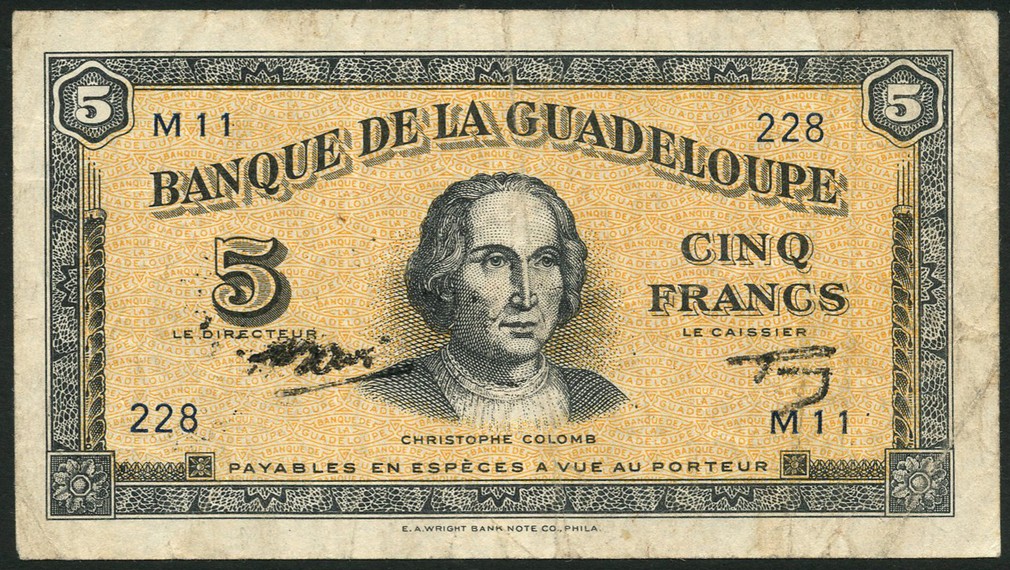 Banque de la Guadeloupe, 5 francs, ND (1945-1946), serial number M11-228, orange and black, Christopher Columbus at centre, Boudin and Gascon signatures