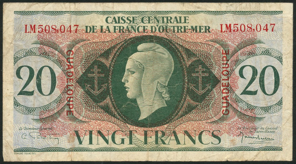 Caisse Centrale de la France d'Outre-Mer, Guadeloupe, 10 francs, ND (1944), red serial number prefix GB, violet, pale blue and red-brown, head of Marianne at centre, anchor conjoined with the cross of Lorraine at left and right, GUADELOUPE in red at left and right, Postel-Vinay and Leclerc signatures, reverse violet and pale blue, legal text in oval at centre, also 20 francs, red prefix LM, as 10 francs but green and pale red, reverse green and pale orange