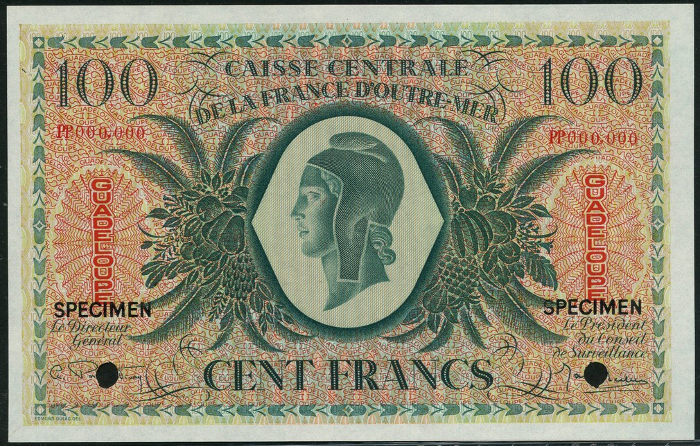 Caisse Centrale de la France d'Outre-Mer, Guadeloupe, specimen 100 francs, ND (1944), red serial number PP 000000, green and pale red, head of Marianne at centre, exotic fruits and flowers to left and right, GUADELOUPE in red at left and right, Postel-Vinay and Leclerc signatures, reverse green and pale orange, allegorical symbols of trade and commerce