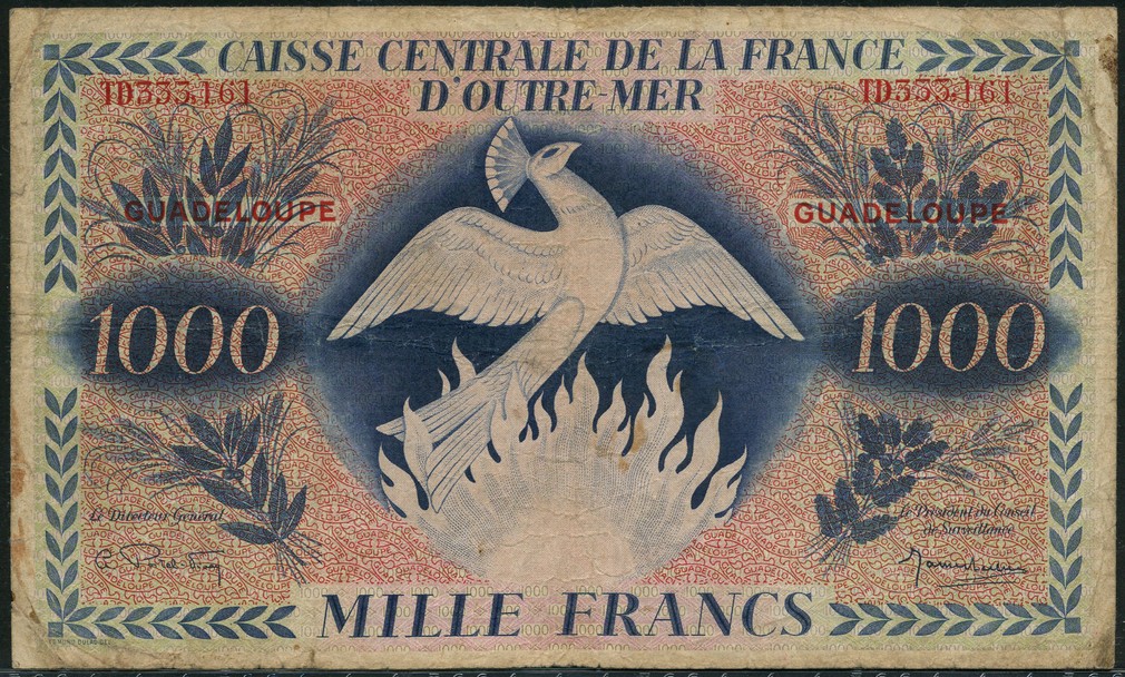 Caisse Centrale de la France d'Outre-Mer, Guadeloupe, 1000 francs, Phoenix, ND (1944), red serial number TD 333161, blue and pale red, phoenix arising from flames at centre, value at left and right, GUADELOUPE in red at left and right, Postel-Vinay and Leclerc signatures, reverse blue, allegorical scenes of war and peace at left and right